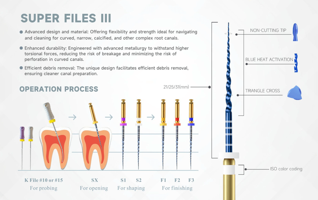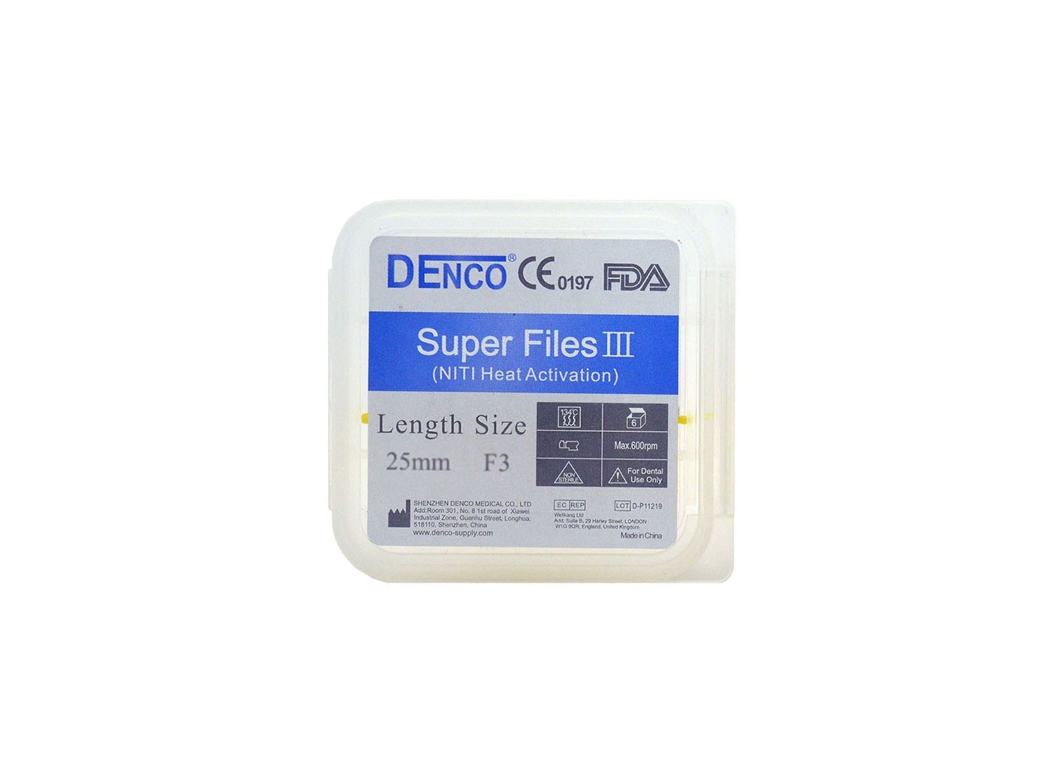 فایل روتاری دنکو بلو Denco Blue SUPER FILES III یک فایل روتاری حرفهای است که با طراحی پیشرفته و مواد مقاوم ساخته شده است. این فایل برای کانالهای ریشه پیچخورده، باریک و کلسیمی مناسب است و آمادهسازی دقیق و ایمن کانالها را فراهم میکند.