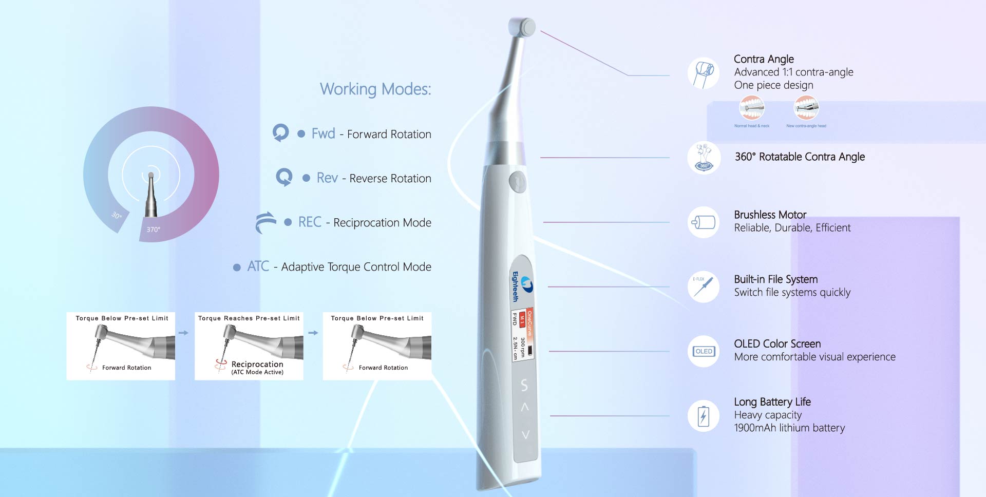 شکست فایل یکی از مهم ترین خطاهای بالینی است و اغلب ریشه در کنترل نامناسب تورک و یا گیرکردن ناگهانی دارد. E-Value با امکان تنظیم دقیق تورک تا 5.0 N·cm و پشتیبانی از Auto-Reverse/Auto-Stop ریسک شکست را کاهش می دهد. همچنین قابلیت REC (Reciprocation) وقتی مفید است که بخواهیم زاویه حرکت را محدود کنیم و تنش پیچشی را کاهش دهیم؛ این حالت در کانال های بسیار منحنی یا در ری-تریتمنت کاربردی است.