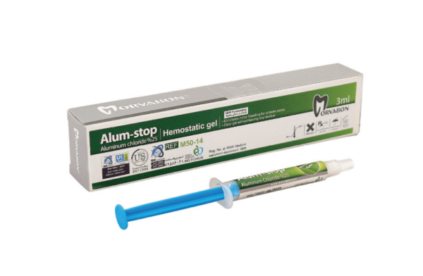 ژل انعقاد خون مروابن AlumStop یک خون بند دندانپزشکی قوی با کلرید آلومینیوم 25 درصد است. این ژل هموستاتیک فاقد رنگ در سرنگ 4.2 گرمی عرضه میشود و برای کنترل خونریزی لثه، کنترل مایعات sulcular و هموستازی سریع در پروسیجرهای ترمیمی و پروتزی طراحی شده است.