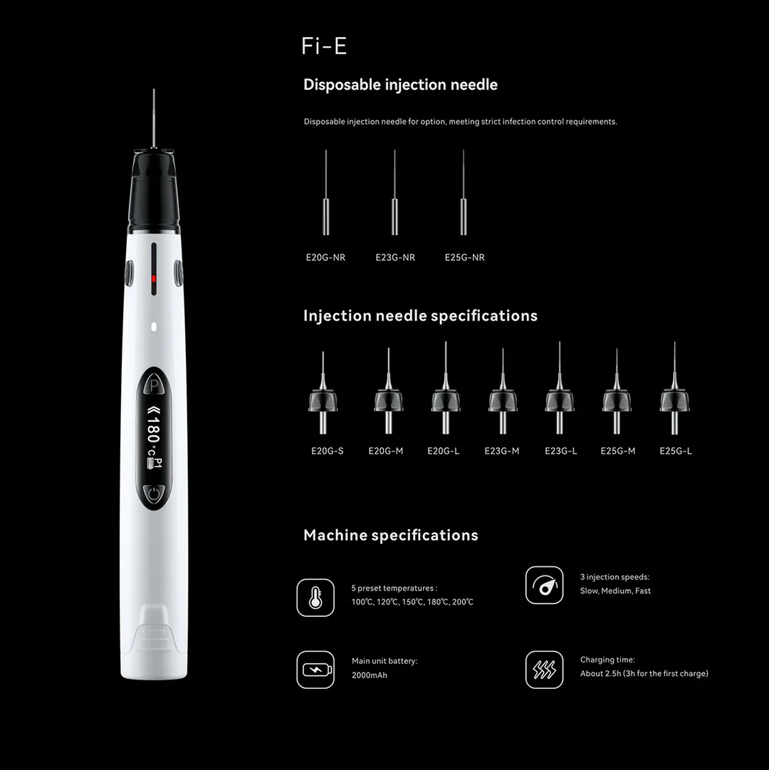 FI-E با ساختار بیسیم و وزن بسیار سبک (۱۴۸ گرم برای هندپیس) امکان کنترل دقیق و بدون خستگی را فراهم میکند. طراحی دودکمهای دستگاه باعث دسترسی سریع به تنظیمات دما و تزریق میشود. بدنه ارگونومیک با سطح ضد لغزش، کارکرد طولانیمدت را آسانتر کرده است.